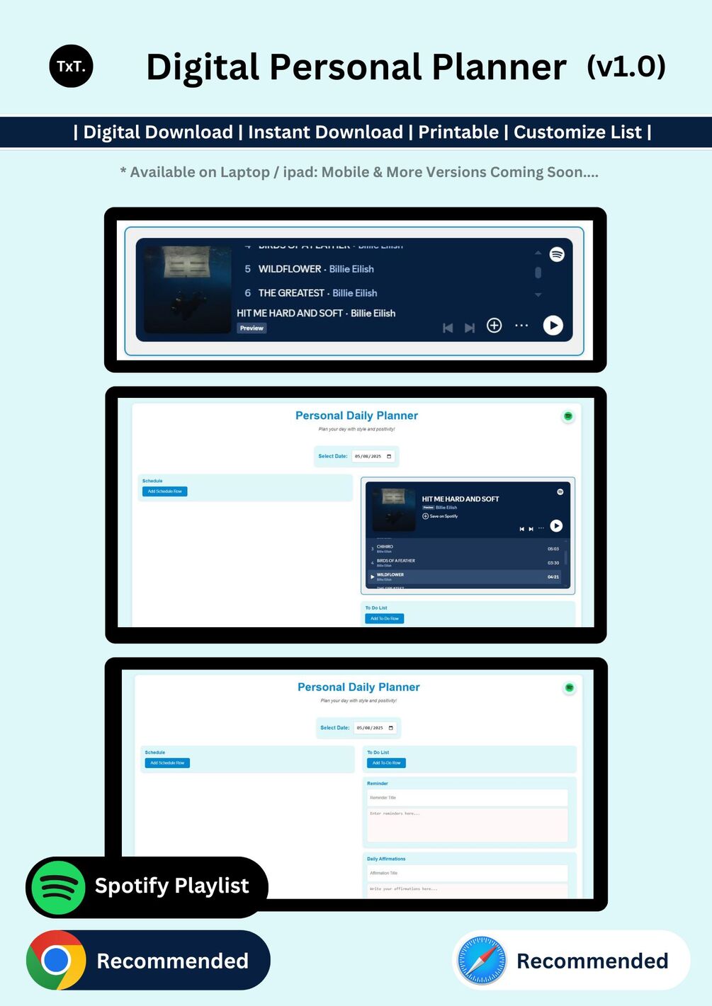 This Digital Daily Planner is designed to boost your productivity, keep your mind clear, and make planning enjoyable. With integrated Spotify playlist support, schedule builder, to-do list, reminders, and daily affirmations, you’ll stay on track and motivated every step of the way.